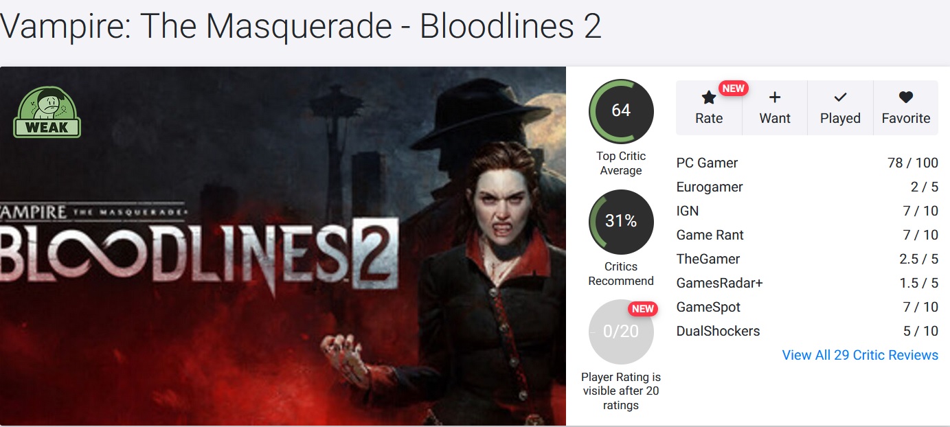 - 원작 Vampire: The Masquerade – Bloodlines(2004)가 가진 ‘선택과 결과’의 깊이와 비교해서 만족스럽지 않다는 의견이 다수.